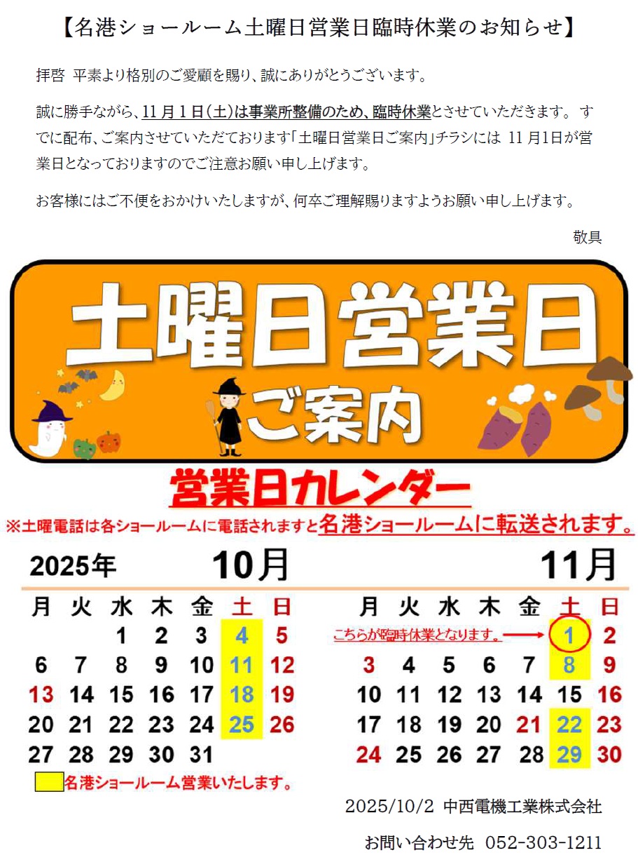 11月1日(土) 名港ショールーム土曜営業臨時休業のお知らせ